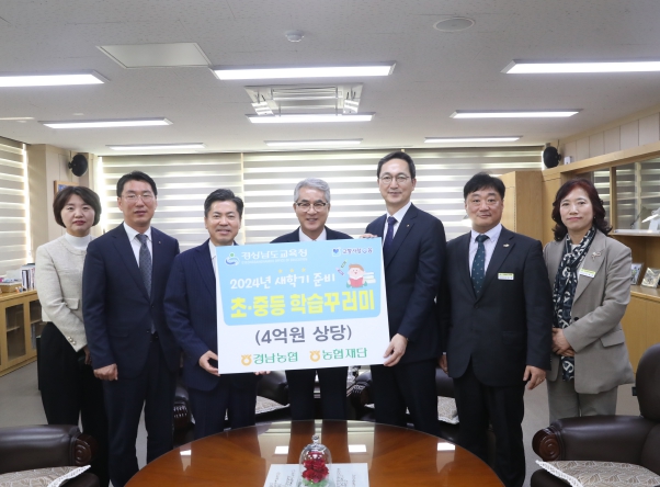 경남농협본부는 농업인 가정의 경제적 부담을 덜어주고 농촌 지역의 교육 여건을 개선하고자 경남교육청과 협력하여 군 지역과 면 단위 초·중학생 2,670명에게 학습꾸러미를 지원한다.