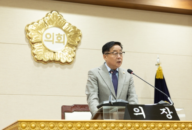 ![]() 윤창철 의장이 제364회 임시회 제1차 본회의에서 ‘택지개발 지연에 따른 조속시행 및 손실대책 마련 촉구 건의안’을 채택하고 있다. |