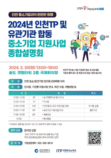 이날 설명회에는 인천TP 뿐만 아니라 ▲인천창조경제혁신센터 ▲인천상공회의소 지식재산센터 ▲기술보증기금 인천지역본부 등 유관기관이 함께 참여해 기관별 지원사업을 소개한다.