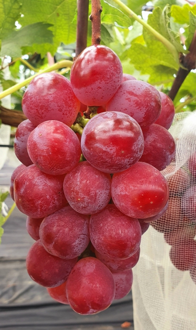 ‘글로리스타’품종은 9월 하순~10월 상순에 수확, 포도알이 크고 당도가 20。Brix 정도로 높으며 청량한 식감을 가진 송이 전체가 붉은색으로 착색이 잘되는 수출 주력 품종이다.