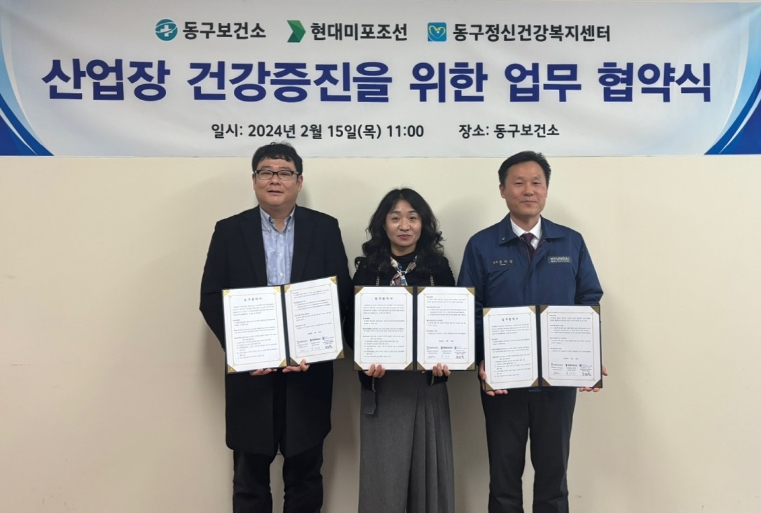이번 협약은 지역 내 외국인 노동자 및 취약 노동자의 증가에 대응하여 지역 내 산업체와 건강증진 업무 협력의 필요성에 따라 추진됐으며, 협약식에는 동구보건소 보건소장, 현대미포조선 안전환경고객지원 부문장, 동구 정신건강복지센터 센터장과 관계자들이 참석했다.