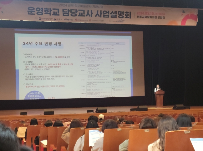 이서기 문예체건강과장은 “학교 예술강사 지원사업을 내실 있게 운영해 학생들의 예술체험 기회를 확대하고, 예술적 감수성을 함양해 실력과 바른 인성을 갖춘 전북의 인재를 보다 많이 양성할 수 있도록 하겠다”고 강조했다.