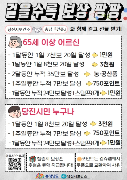 당진시보건소 관계자는 “걸으면 걸을수록 건강 이득도 되고, 소소한 선물도 많이 받을 수 있다. 시민들이 일상생활에서 가장 손쉬운 운동인 걷기 실천을 꾸준히 해 주시길 당부한다”라고 밝혔다.