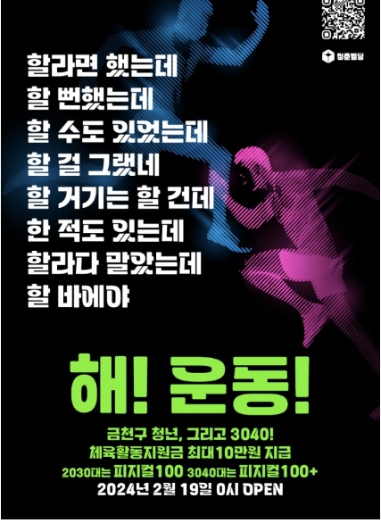 ‘피지컬100’은 주 2회씩 4주간 총 8회 생활체육시설 이용 후 사진을 인증하면 체육활동 지원금을 최대 10만 원 지급하는 사업이다. 인정가능한 체육시설은 금천구 소재 헬스장, 요가, 수영장 등이다. 모집대상은 금천구에 주민등록 된 만 19세 이상 39세 이하 100명이다.