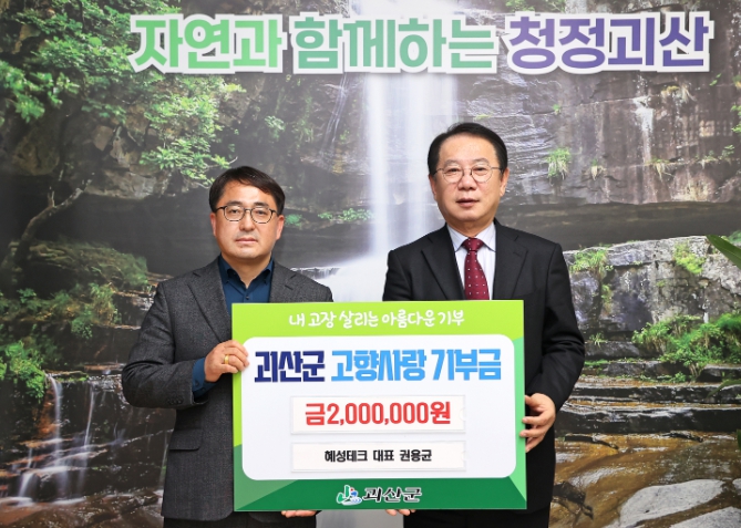 청주시에서 혜성테크를 운영하는 권 대표는 “사회에 보답하기 위한 방법을 찾던 중 괴산군에서 고향사랑기부금을 좋은 일에 사용한다는 소식을 접했다”라며 “괴산군이 고향사랑기부제를 통해 더욱 발전하는 모습을 기대한다”고 전했다.