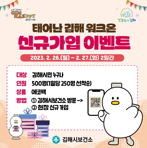 태어난 김해, 워크온 신규가입 이벤트에 참여하고픈 김해시민은 행사 당일 오전10시 부터 오후3시(12시부터 1시 제외)까지 김해시보건소 1층 로비로 폰을 소지하고 방문하면 된다.