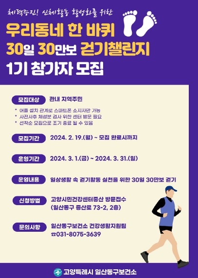 '우리동네 한 바퀴 30일 30만보 걷기챌린지'는 지역 주민들의 일상생활 속 건강생활습관 형성을 위한 30일간 30만보 걷기를 목표로 하는 도전프로그램으로 신체활동의 동기를 부여하고자 마련한 프로그램이다.