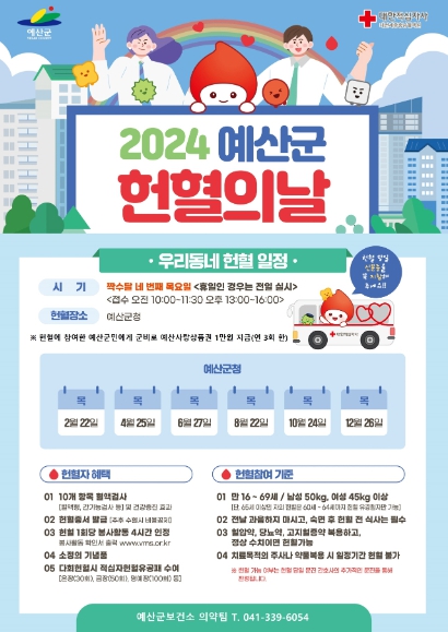 헌혈자는 간기능, B형 및 C형 간염 검사를 받을 수 있으며, 주민등록상 주소가 예산군인 군민이 헌혈에 참여하는 경우 예산사랑상품권 1만원과 기념품을 제공한다.