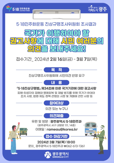 시민 의견접수는 16일부터 3월 7일까지 진행되며, 국가에 대한 권고사항 관련 의견이 있는 시민은 시청을 방문하거나 등기우편(광주광역시 서구 내방로 111, 5·18민주과(치평동)), 이메일로 제출하면 된다.