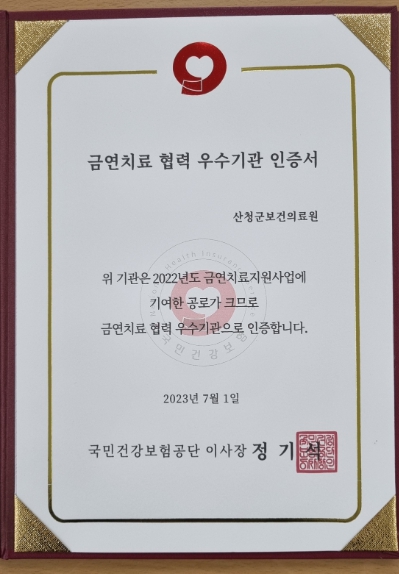 ![]() 산청군보건의료원 금연치료 협력 우수기관 선정 증서 |