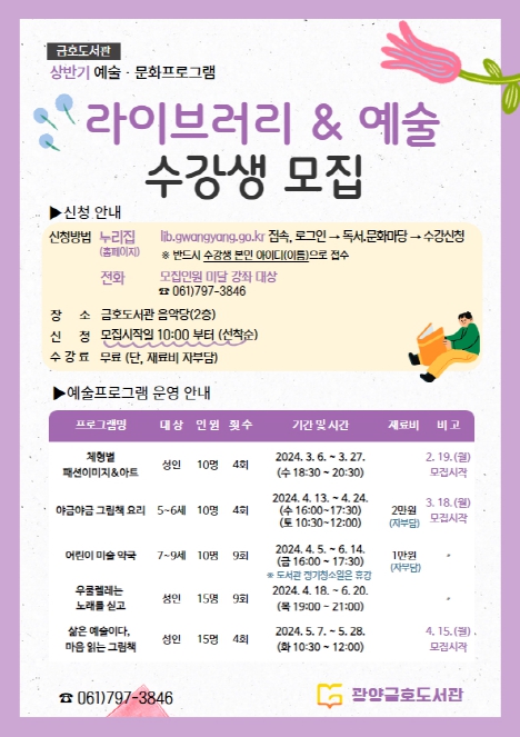 ![]() 광양금호도서관, 상반기 예술문화프로그램 수강생 모집 |