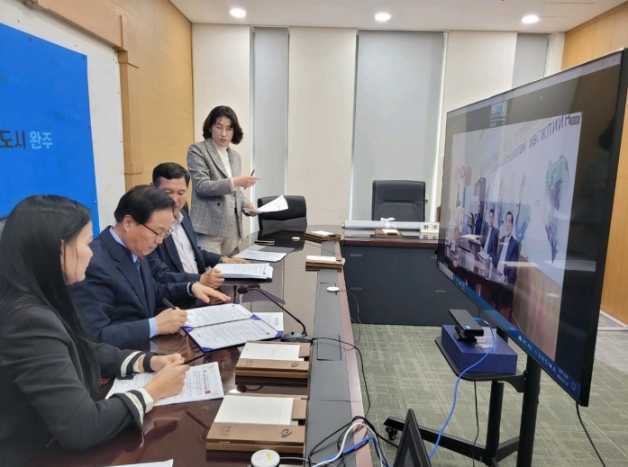 16일 완주군은 최근 유희태 완주군수와 날라이흐구 라드나바자르 초이진삼부 구청장, 만뚜울 부구청장 등을 비롯한 양 도시 관계자 10명이 참석한 가운데 영상으로 업무협약으로 체결했다고 밝혔다.