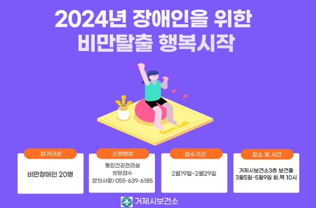 신청 대상은 2월 19일부터 2월 29일까지 거제시민 중 비만장애인 남성, 여성, 체지방률 기준으로 선착순 20명을 모집한다.