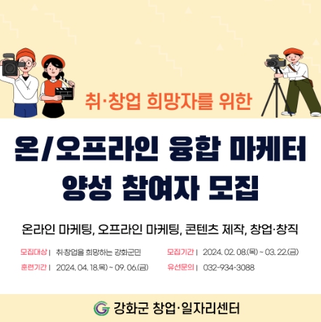 ![]() 강화군 창업·일자리센터, 온/오프라인 융합 마케터 양성 교육생 모집 |