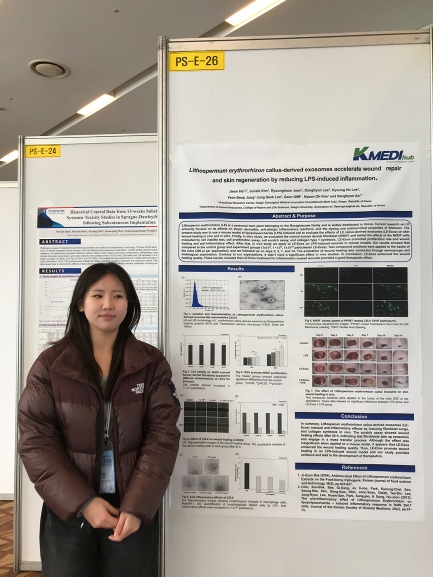 이번 동계 심포지엄에서 케이메디허브 하지언 학생인턴(대구대학교 동물자원학과)은 전임상센터 의료기기평가팀의 지도를 통해 식물유래 엑소좀 활용 창상 피복제 유효성 평가 및 피부재생과 항염증 효과를 입증하여 의료기기 개발 가능성을 제시함으로써 학부생으로는 유일하게 우수 포스터상을 수상했다.