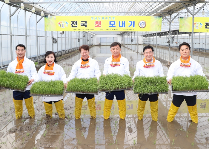 이날 행사에는 이천시의회 의원 6명을 비롯한 김경희 시장과 권혁준 호법농업협동조합장 등 50여 명이 이천시 호법면 소재 240평 규모의 연동 하우스 시설에서 전국 첫 모내기를 진행했다.