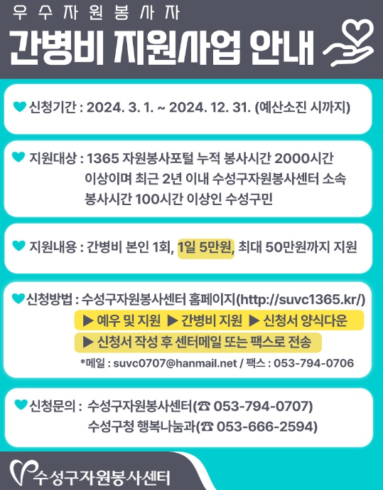 상세한 신청 절차와 필요 서류 등은 수성구자원봉사센터 홈페이지에서 확인 가능하다.
