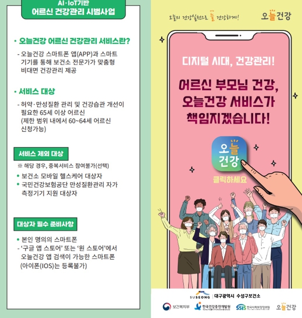 이 사업은 고혈압·당뇨 등 만성질환 관리가 필요하거나 평소 식습관, 약 복용 등 건강생활습관 개선이 필요한 만 65세 이상 수성구 주민 가운데 스마트폰 소지자를 대상으로 진행한다.