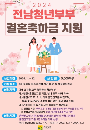 청년부부 결혼축하금 지원은 전남도가 2021년 전국 광역시·도 중 최초로 시행한 사업으로, 49세 이하 부부가 대상이다. 혼인신고 후 6개월이 경과한 날부터 신청할 수 있다. 신청일 직전까지 부부 모두 전남에 6개월 이상 계속 주소를 두고 거주해야 한다. 다만 부부 중 누구라도 이전에 청년부부 결혼축하금을 수령한 경우 지원 대상에서 제외된다.
