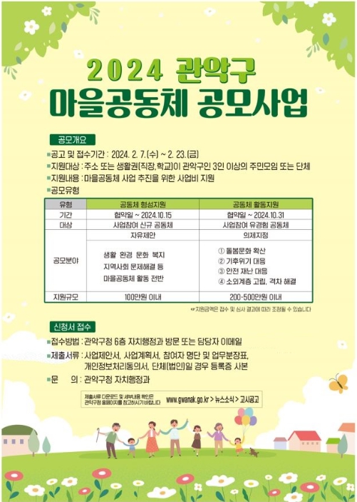 '2024년 관악구 마을공동체 공모사업'은 주민 스스로 지역문제 해결, 이웃 간 소통 활성화, 공동체 관계 회복을 통해 마을공동체를 활성화할 수 있도록 사업계획과 실행과정을 지원하는 사업이다.