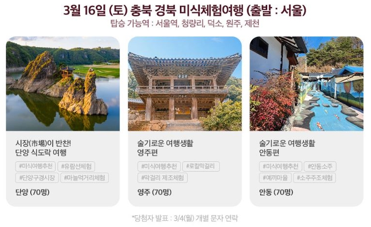 이 행사는 ‘3월엔 여기로(여행가는 달, 기차로 떠나는, 로컬 여행)’라는 주제로 지역의 떠오르는 명소, 전통문화 및 지역특산물, 전통시장 등을 총 23개 코스로 체험할 수 있는 당일치기 기차여행이다.