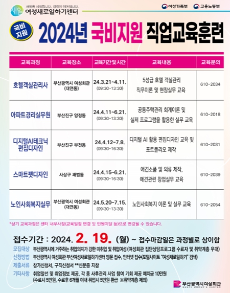 ![]() 부산여성새로일하기센터, 2024년 여성직업교육훈련 참가자 모집 |