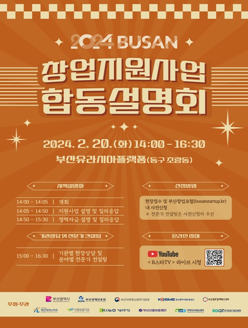 설명회는 1부 시책 설명회와 2부 현장 상담으로 구성되며, 1부에서는 부산경제진흥원 등 9개 기관에서 창업지원사업 및 정책자금을 설명한다.