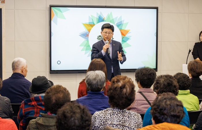 ![]() 최충규 대덕구청장이 법동종합사회복지관에서 열린 법동 돌봄건강학교 입학식에 참석한 주민들에게 인사말을 전하고 있다. |