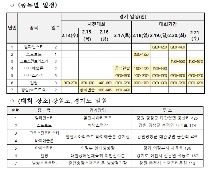 특히 이번 대회에서는 3월 2일부터 튀르키예에서 열리는 ‘2023 에르주룸 동계 데플림픽’과 강릉에서 열리는 ‘2024 세계휠체어컬링선수권대회’ 출전을 앞두고 우리 선수단의 기량을 점검한다. 아울러 ‘2026년 밀라노 동계패럴림픽’을 대비해 ‘알파인스키’ 슈퍼대회전 번외경기를 지속적으로 이어가는 등 참가종목에 대한 국제경쟁력을 강화할 수 있는 방향으로 경기를 치른다.