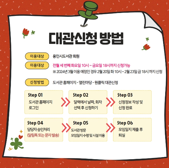 대관 신청은 용인시 도서관 홈페이지에서 회원가입 후 ‘열린마당’ - ‘원클릭대관신청’에서 하면 된다. 신청 기간은 대관일 전월 세 번째 화요일 10시부터 금요일 오후 6시까지다. 대관 신청이 승인되면 문자 또는 카카오톡으로 신청자에 안내한다.