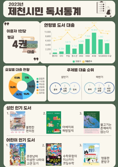 2023년 제천 시민에게 가장 많은 사랑을 받은 도서는 김호연 작가의 '불편한 편의점'과 최재훈 글·정주연 그림의'흔한남매 이상한 나라의 고전읽기'였다. 아동의 경우에는 쉽고 재미있게 정보를 얻을 수 있는 학습만화가, 성인의 경우에는 위로를 얻을 수 있는 희망적인 소설이 인기를 얻었다. 이러한 데이터를 바탕으로 시립도서관에서는 오는 24일 김호연 작가와의 만남을 추진할 예정이다.