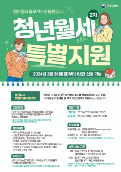 지원 대상은 ▲청약통장에 가입한 19세에서 34세 이하 청년으로 ▲부모님과 별도로 거주하는 무주택자이면서 ▲임차보증금 5천만 원 및 월세 70만 원 이하 주택에 거주하는 청년이다.