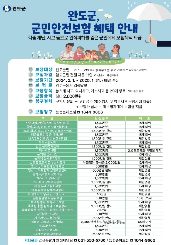 보험료는 군에서 전액 부담하며 완도군민과 등록 외국인은 별도의 가입 절차나 조건 없이 자동으로 보험 수익자가 되어 혜택을 받을 수 있다.