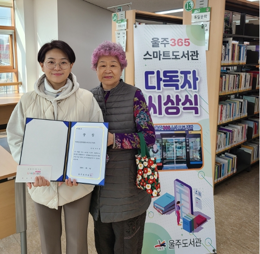울주도서관은 ‘울주365스마트도서관’ 개관 1주년을 기념해 지난 18일 스마트도서관 이용자 중 다독자 5명에게 울주도서관장상과 시상품을 전달했다. 다독자들은 지난 1년간 평균 90여 권을 읽었다.