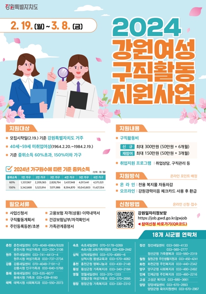 신청희망자는 2월 19일부터 3월 8일까지 강원일자리정보망 사이트에 구직정보를 등록한 후 온라인으로 신청하면 된다.
