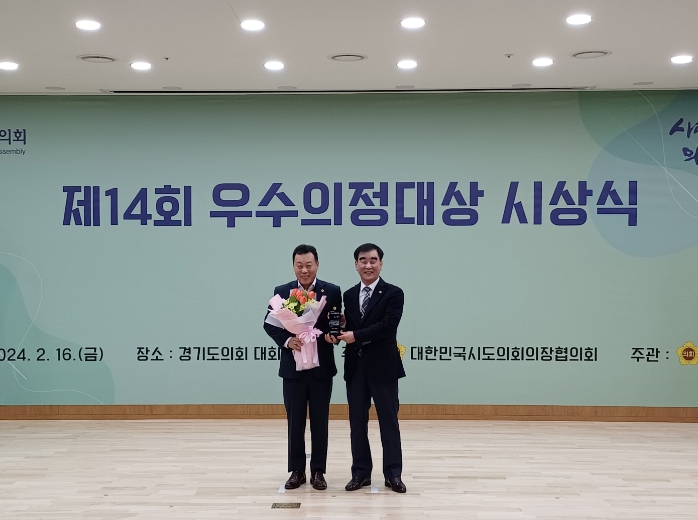 ‘우수의정 대상’은 주민 삶의 질 향상과 지역발전에 기여한 의원을 대상으로 ‘대한민국 시도의회 의장 협의회’가 전국 광역의원을 선정해 수여하는 상이다.