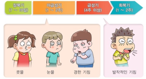 발작적인 기침이 주요 증상이며 콧물, 호흡곤란 등이 나타날 수 있다.