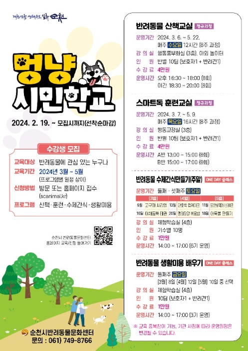 강좌 참여는 ‘순천시 반려동물문화센터 누리집에서 오는 19일부터 선착순으로 접수받을 예정이다.