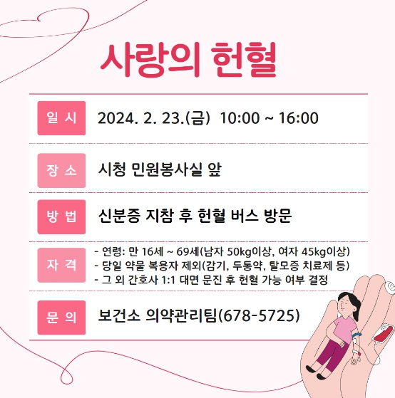 보건소 관계자는 “저출산, 고령화로 헌혈 가능 인구가 감소하고 있고, 독감 등 호흡기 감염 질환의 확산 등으로 혈액 수급이 어려운 상황”이라며 “소중한 생명을 살릴 수 있는 사랑의 헌혈에 참여해주시길 바란다.”고 말했다.