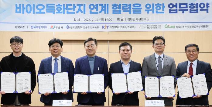 이날 협약을 통해 전북자치도와 정읍시, 한국생명공학연구원 전북분원, 안전성평가연구소 전북분소, 한국원자력연구원 첨단방사선연구소, 농축산용미생물산업육성지원센터는 공동 상생 연계방안을 모색하며 ▲바이오 특화단지 유치 및 활성화를 위한 연계 ▲바이오 분야 R&D 공동 협력 ▲바이오산업 육성을 위한 각 기관과의 사업 발굴 등을 협력하기로 했다.