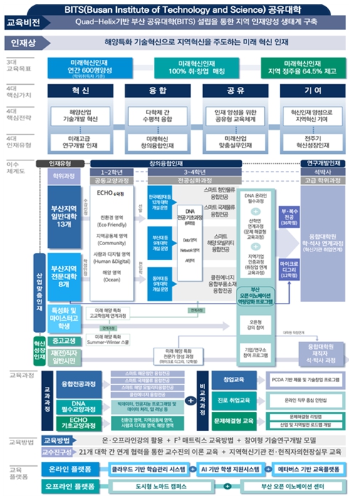 부산 BITS공유대학은 교육부 지자체-대학 협력 기반 지역혁신사업(RIS)의 일환으로 14개 지역대학이 참여, 핵심 분야 해양 특화 인재 양성을 위한 대학 간 융합교육혁신 모델이며, 선발된 신입생은 3월부터 본격적으로 온라인 이론과 오프라인 실습 과정 등 대학 간 공동 교과과정에 참여한다.