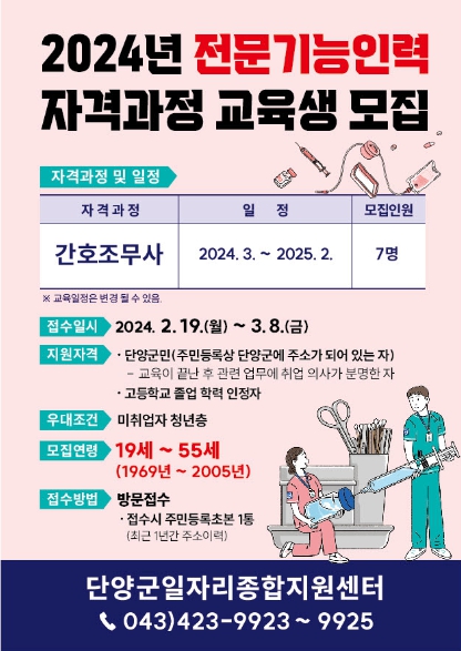 관련 업무에 취업 의사가 분명한 고등학교 졸업 이상의 19세∼55세의 단양군민이면 누구나 지원할 수 있다.