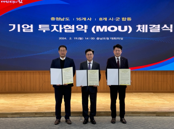 ![]() 19일 충청남도 대회의실에서 열린 투자협약식(왼쪽부터 김대열 청명 대표이사, 김태흠 충남지사, 서산시 홍순광 부시장) |