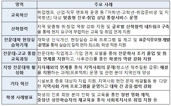 또한, 각 대학의 ‘지방 전문대학 활성화 사업’ 성과도 함께 공유한다. 2023년에 신설된 ‘지방 전문대학 활성화 사업’은 전문대학 혁신지원사업에 참여하는 전문대학 중 비수도권 전문대학과 광역지자체가 연계·협력하여 지역사회 발전에 필요한 특성화 인재를 양성하는 사업이다. 본 사업에 비수도권 전문대학 68개교가 참여하고 있으며, 올해 750억 원을 지원할 계획이다.