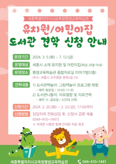 프로그램 참여를 희망하는 기관에서는 2월 20일 9시부터 평생교육학습관 도서관 견학프로그램 담당자와 전화 상담 후에 신청할 수 있다.