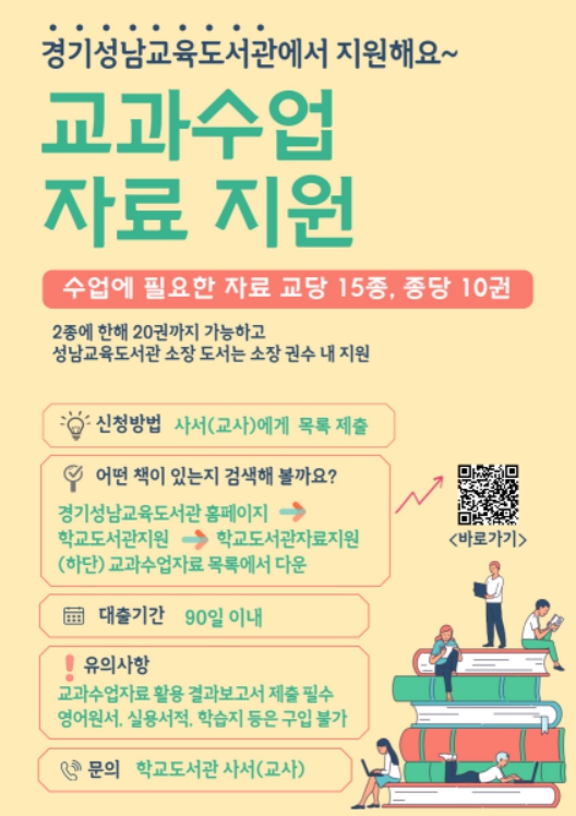신청은 경기성남교육도서관 홈페이지에 탑재되어있는 교과수업자료 목록에서 필요한 자료가 있는지 우선 검색해보고 K-에듀파인을 통해 신청하면 된다.