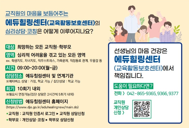 에듀힐링센터는 2024년 전문상담사·코치 49명을 위촉하여, 대전 관내 교직원 및 학부모 대상 심리상담․코칭을 제공한다. 전문상담사와 코치는 공모를 통해 에듀-카운슬러로 위촉하고 있으며, 역량강화 워크숍 및 사례 발표 등을 통해 전문성을 향상시킨다. 그 결과, 지난 9년간 에듀힐링센터의 상담 만족도는 98.2%의 높은 점수를 기록하고 있다.