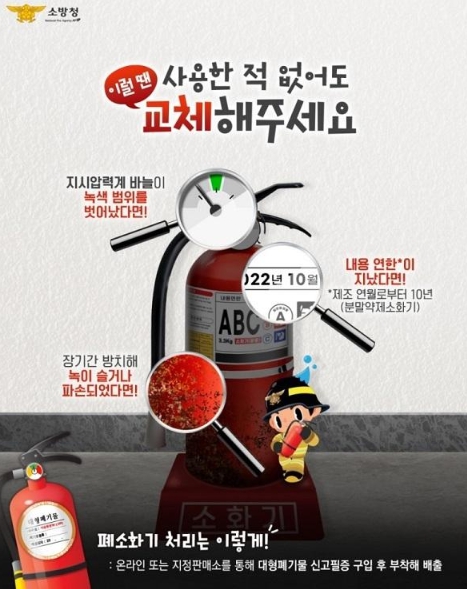 소화기 교체 및 폐기 기준은 ▲지시 압력계 바늘이 녹색 범위를 벗어난 경우 ▲제조일로부터 10년이 경과된 경우 ▲장기간 방치에 녹이 슬거나 파손된 경우 등이다.