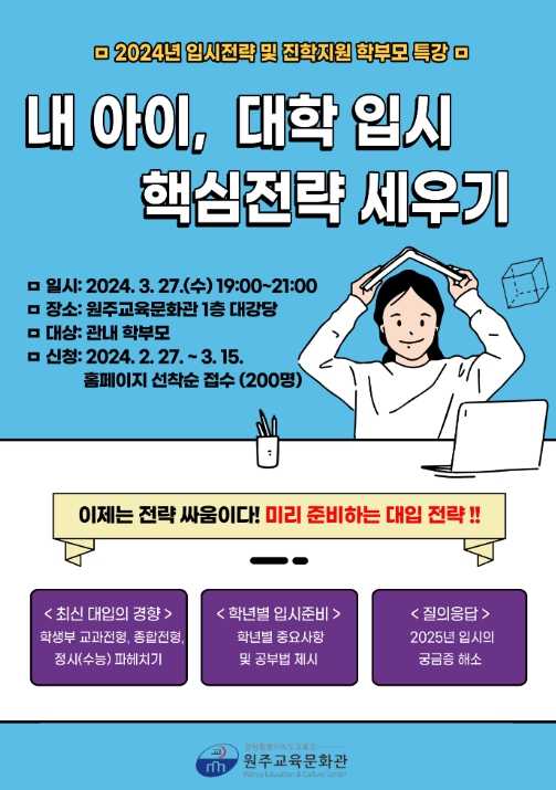 유선종 원주교육문화관장은 “이번 특강을 통해 맞춤형 진학 정보를 습득하고 체계적인 입시전략을 수립하는 기회가 되길 바란다”라고 말했다.