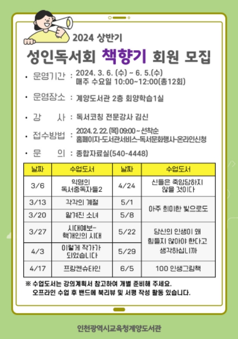 성인독서회에 참여를 원하는 인천시민은 계양도서관 홈페이지 도서관서비스 – 독서문화행사 - 온라인신청 코너에서 22일부터 신청할 수 있고, 비회원도 신청 가능하다.
